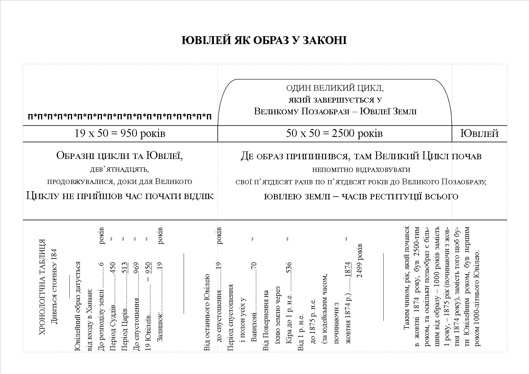 Ми вже звертались до методів рахування субот: множення суботи, або сьомого дня, на сім (7 х 7 = 49) вказувало на П’ятидесятницю, Ювілейний День, який наступав після них; також множення сьомого року на сім (7 х 7 = 49) складало цикл, який вказував на п’ятдесятий, або Ювілейний, Рік і вів до нього. Якщо дотримуватись такої системи, то виявиться, що для досягнення великого позаобразу, який ми шукаємо, нам схожим чином треба піднести до квадрату Ювілей – тобто помножити п’ятдесятий рік на п’ятдесят. Інакше кажучи, позаобразний цикл повинен вираховуватись (за допомогою вказаного тут методу) множенням образного Ювілею, тобто п’ятдесятого суботнього року, на п’ятдесят, так само як для його визначення ми множили сьомий суботній рік на сім (3 М. 25: 2-13).