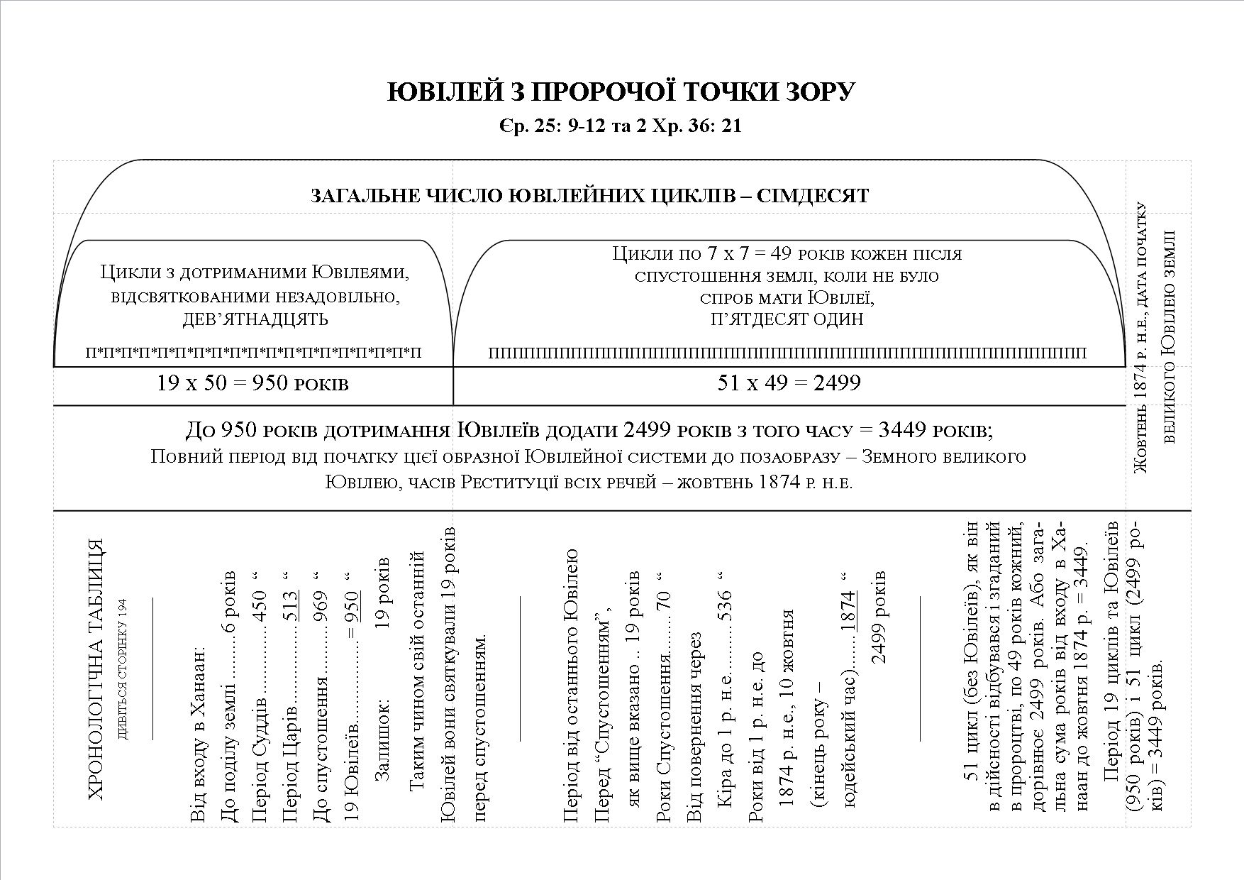Отже, бачимо, що не лише ізраїльський Ювілей ясно й переконливо відображав великі “часи реституції всього, про що провіщав Бог від віку устами всіх святих пророків Своїх”, але й метод його числення так само ясно вказує на дату початку Великого Ювілею Землі. Якщо ми не можемо прийняти цих висновків, то нам не залишається іншої альтернативи, як признати, що цей образ минув без виконання, не дивлячись на досить переконливе твердження нашого Господа, що це неможливо – що легше проминути небесам та землі, ніж одній йоті чи титлі Закону проминути, не здобувши виконання (Мт. 5: 18). Ми приймаємо ці божественно вказані факти, якими б вражаючими не здалися висновки, які ми розсудливо зобов’язані почерпнути з них.
